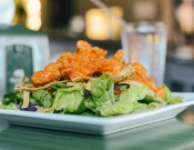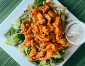 Bañados en nuestra salsa secreta, sobre una fresca cama de ensalada, zanahorias y tiritas de tortillas fritas. ¡Acompañada de aderezo Comicx ranch!